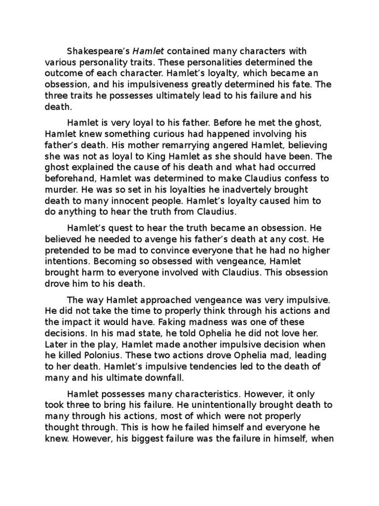· 10 Lines on Hamlet Essay in English 1. The Tragedy of Hamlet, Prince of Denmark, also known as Hamlet is a play written by William Shakespeare. 2. Hamlet is said to behave written between to 3. Hamlet is the longest play written by Shakespeare with 30, words. 4 Hamlet has lived through plenty of ups and downs throughout his childhood. He has been lost and confused within himself, but knew he wanted one thing, which was revenge on his fathers killer, Claudius. His passion of hate developed for Claudius as he married Hamlets mother shortly after the king’s death Hamlet is a tragic story where there is a hero and criminals. Everyone has an imperfection that leads to something tragic or r emotional in all of the history. The main evil in this story is Hamlet, Prince of Denmark. In Shakespeare’s Theatrical Story,