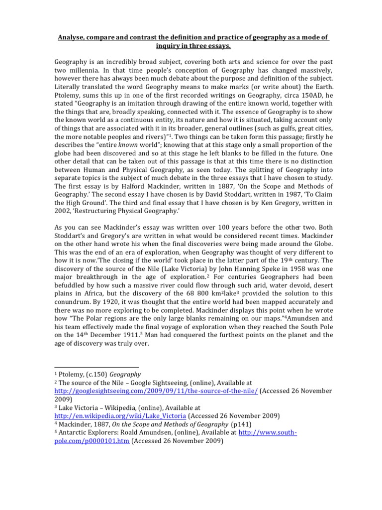 17 essay samples found Similarities between Zheng he and Christopher Columbus Christopher Columbus and Zheng He were both century explorers who made significant discoveries during their lifetime. Columbus was an Italian explorer, navigator, and colonist who sailed for the Catholic Monarchs of Spain during his voyages across the Atlantic Ocean · BRANCHES OF GEOGRAPHY (BASED ON SYSTEMATIC APPROACH) 1. Physical Geography (i) Geomorphology Is devoted to the study of landforms, their evolution and related processes. (ii) Climatology Encompasses the study of structure of atmosphere and elements of weather and climates and climatic types and regions · Oceanography is a boarder term in which many sciences focused on the common goal of understanding then oceans. Geology, Physics, Geochemistry, Geophysics, Botany, Zoology, Mathematics, and Meteorology all play important role in the expanding over knowledge of the oceans. The Science of Biogeography Example essay. Last modified: 9th Sep